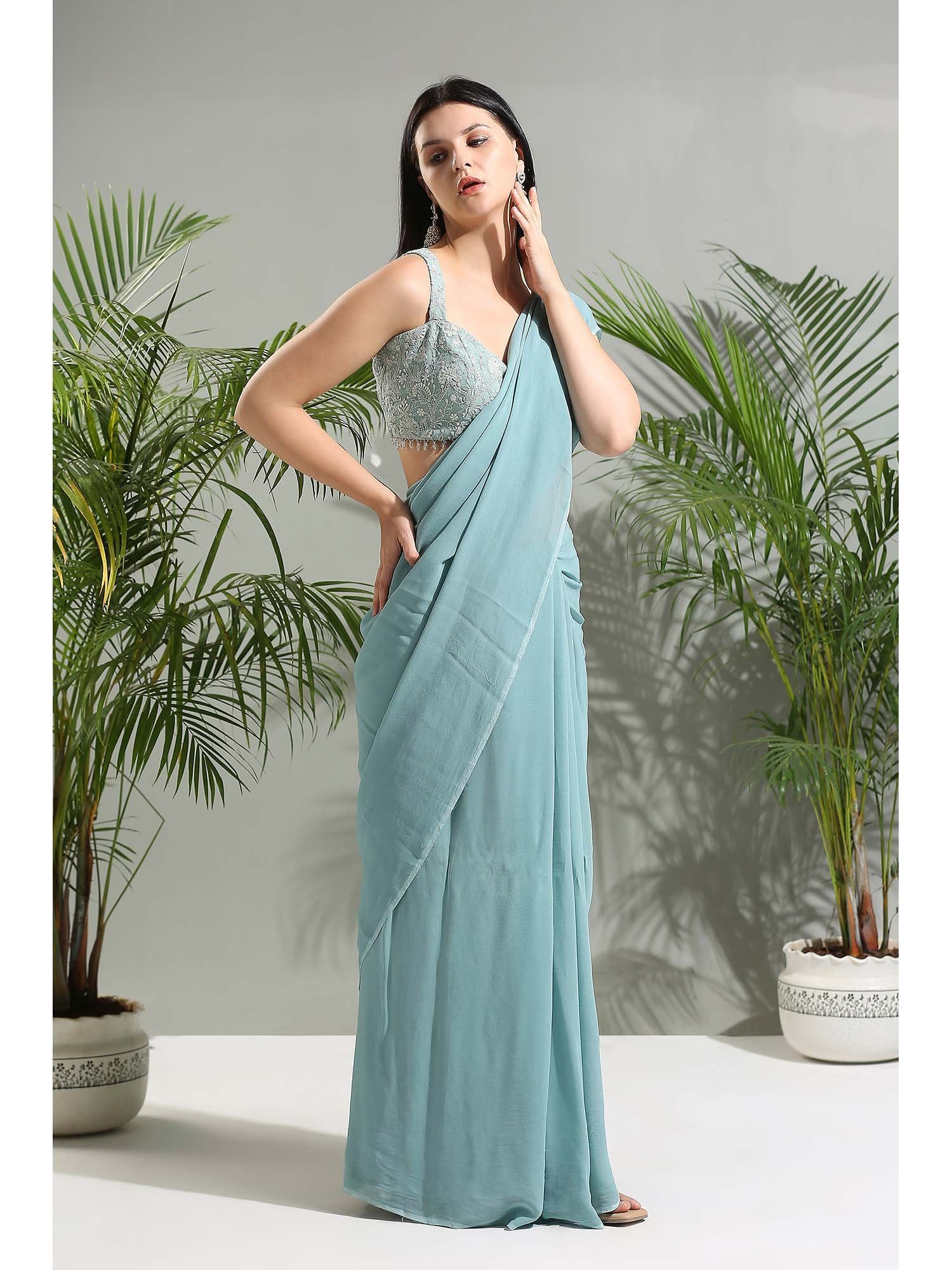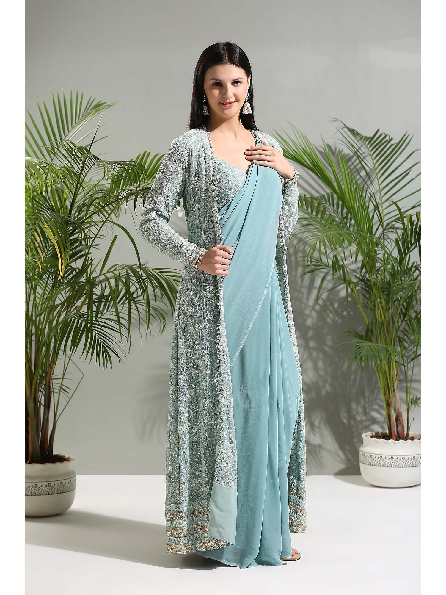 Dusty Blue Saree with Stitched Blouse and Jacket