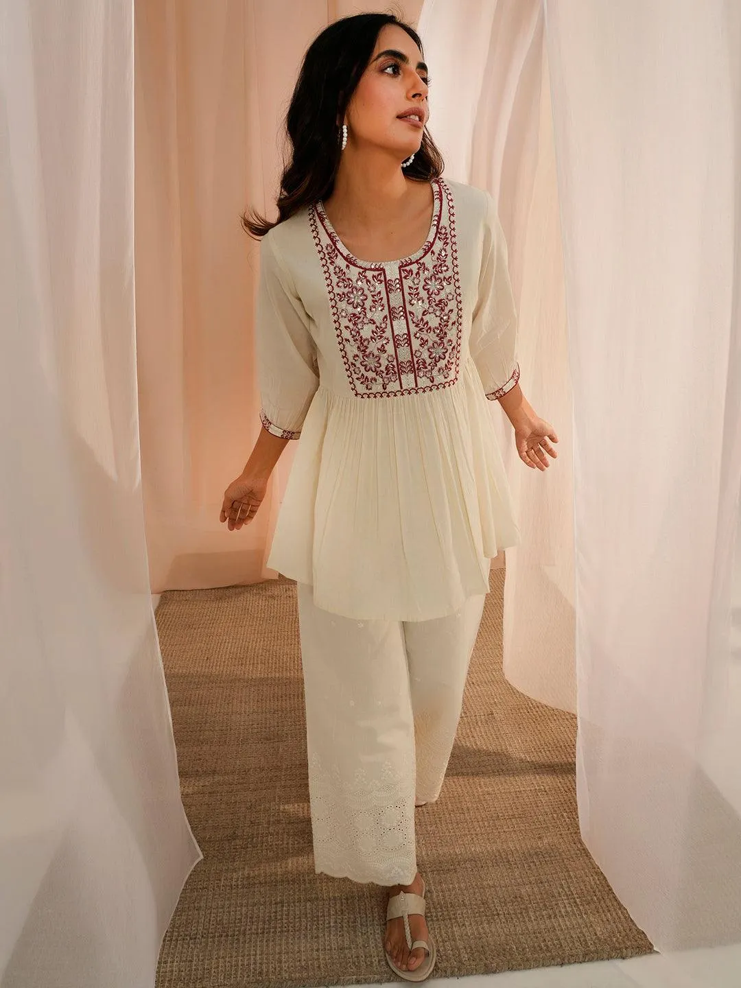 Off White Yoke Design Cotton A-Line Kurti